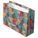 Ein großer Beutel, entworfen aus farbenfrohen Geweben aus Farbenbarn in Aquamarin, gelb und orange für jedes gelegentliche Geschenk