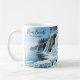 A coffee mug with an illustration of Door County, Wisconsin in the winter The pretty dune ledges covered in icicles and frozen blue ice, blue water of Lake Michigan hitting against the bluffs, Sun shining lighting up the sparkling snow and ice.