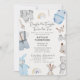 Ein einzigartiges Design für Zwillingsjungen, mit einem Set von Babykleidung, Schuhen, Spielzeug und Regenbogen in modernen, subtilen Farben wie Blau, Grau, Beige. Der Header in handgeschriebener Kalligrafie lautet "Doppelte die Mühe, doppelt so viel Spaß". Personalisieren Sie Ihre Vorlage vorne und hinten.