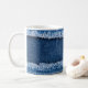 Blauer Jeans Stoff Rahmen. Bleichte Denim-Gewebe mit Randstreifen auf blauem Denim-Hintergrund, Textstelle, Kopierraum. Worn Jeans Lässige Doppelfarben-Patch Jeans Stoffrahmen in lässigem blauen Chic. Bleichdenim mit Randstreifen für diese einmalige Touch. Mit diesem blauen Stoffrahmen schaffen Sie stilvolle Denim-Villen. Doppel der Denim, doppelt der Spaß! Denim, Textur, Patchwork, gewürfelt, Muster, Hintergrund, Dekoration, Rahmen, Vintag, blau, Stoff, alt, Kleidung, Textil, Baumwolle, Leinwand, Stoff, Faser, Bekleidung