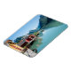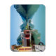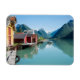 Rechteckiger Andenken-Foto-Magnet einer Landschaft mit Boathouses im Dorf Fjærland (Mundal) und Berge mit Reflektion im Wasser des Fjords Fjærlandsfjord, Sogn og Fjordane in Norwegen.