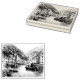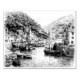 Eine handgezeichnet Schwarz-Weiß-Skizze von Lynmouth, Devon, einem charmanten Küstenort, in dem der East Lyn River das Meer trifft. Diese Vintage Line Illustration erfasst den Hafen, Fischerboote, Hütten am Flussufer und dramatische Klippen. Ideal für Bewunderer von Reisen, maritimer Geschichte und traditioneller englischer Dorfszenen.