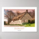 Vintages Poster im Bahnstil mit Dorset-Strohdach-Hütte, England.