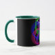 Modern 3D circular inspired geometric coffee mug with green handle. Unique features include a colorful double loop mesh styled center design, additional mug color options and text customization.