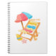 A colorful summer design featuring a lounge chair, a striped parasol, a straw hat, a starfish, and a basket of flowers. A soft and cheerful watercolor style, perfect for celebrating the joys of summer.