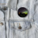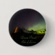 Ein kleines rundes Abzeichen mit einer Fotografie des Doune Broch, Insel von Lewis- und bunte Auroranordlichtern mit Grünem und Lila und Sterne