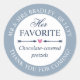Personalisiert ihre Lieblings-Hochzeitskandy-Aufkleber für Ihre Hochzeitstaschen Leckerei, die Sie Ihren Gästen geben, als ein Dankeschön für die Teilnahme an Ihrer Hochzeit! In gebogenem Text gegen eine staubige blaue Grenze, fügen Sie Ihre Namen, Hochzeitstag, und ein Dankeschön. Schreiben Sie den Typ der Leckerei, die der Beutel oder das Packstück enthält. Die Lieblingsticker ihrer Hochzeitsaufkleber sind mit einer romantischen Trennwand versehen, die mit zwei eleganten marineblauen Pfeilen auf ein rosa Herz zeigt.