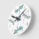 Original Design von Sandra Gale von zwei verschiedenen whimsical Libellen in Blues und Grüntönen umgeben einen Schmetterling als Zentrum der Uhr.