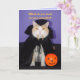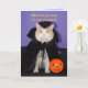 Bubba in einem schwarzen Samtkap und Reißzähne. Außen: "Was will du in deinem Kürbis?" Im Inneren: "Ich mag Garnelen. Ich mache einen Trick, wenn du Garnelen in meinen Kürbis steckst." Dann: "Hoffe, dass du deinen Kürbis voll mit deinen Lieblingsliedern machst!" und "Happy Trick or Treat!" Sie können den Text ändern und anpassen. Bubba wird wirklich Tricks für Garnelen machen. Er wird auf seine Hinterfüße aufstehen und so tanzen und an den Garnelen schwingen, bis er sie ergreift.