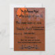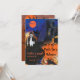 Dracula in langen schwarzen Kap und weiße Weste und Handschuhe mit leuchtenden Kerzen zeichnend mit Vollmond mit Schloss im Hintergrund und dunkelblau Himmel Halloween Kostüm Party Einladung. Schwarze Katze und Raben, schwarzer und orangefarbener Text. Zurück ist für Ihre Party-Informationen. Kunstwerk von PatriciaVilla.