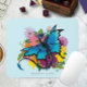 Blau-Schwarz-Drache mit Flügeln aus Schmetterlingen, eingebettet in einen Strauß von bunten Blume in einem hellblauen Hintergrund.
