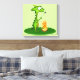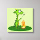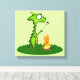 Niedlicher kleiner Cartoon-Drache mit großen googly Augen und einem gelben Horn, das ein Marshmallow über einem Lagerfeuer toastet. Originelle Cartoon-Kunst von Taylor Addams.