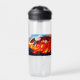 Ein Drache fliegt durch den Himmel und das Feuer über die Landschaft und das Dorf.