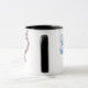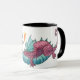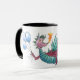 Eine weiße Tasse mit schwarzem Rand und Griff und ein lila und grüner Drache aus einer Aquarellmalerei von Judy Adamson. Passende Grußkarten sind ebenfalls verfügbar.