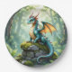 Ein niedlicher, blauer und grüner Drache zum Thema Geburtstagsfeier Teller für Jungen. Ein niedlicher Drache auf einem mossy antiken Stein sci zum Geburtstag Thema.