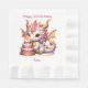 Ein niedlicher, weißer, goldfarbener und rosa Chibi-Drache mit einer Geburtstagstorte Geburtstagsparty, personalisierte Papierservietten. Rosa und goldene Schuppen.