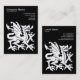 Eine Visitenkartenvorlage mit einem fetten, heraldischen Drachensymbol. Firmenname, Geschäftstyp und Adresse auf der Vorderseite mit Namen, Jobtitel, Telefonie, Web- und E-Mail-Adressen auf der Rückseite, mit dem gleichen Layout.