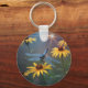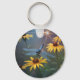 Dieser Schlüsselanhänger hat eine blaue Libelle, die auf einer schwarzen mit Augen Susan ruht.