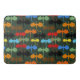 Eine Flügelgruppe aus Drachen in den Farben Schwarz, Braun, Rot, Orange, Gelb, Blau und Grün fliegen Flügel über eine tiefgrüne Kulisse, die sich nach oben erhebt. Die Drachen werden in einem Tätowierungsstil gezeichnet.