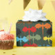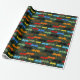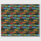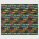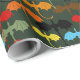 Eine Flügelgruppe aus Drachen in den Farben Schwarz, Braun, Rot, Orange, Gelb, Blau und Grün fliegen Flügel über eine tiefgrüne Kulisse, die sich nach oben erhebt. Die Drachen werden in einem Tätowierungsstil gezeichnet.