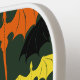 Ein Drachenflügel in den Farben Schwarz, Braun, Rot, Orange, Gelb, Blau und Grün fliegen Flügel über eine tiefgrüne Kulisse, die nach oben aufsteigt. Die Drachen werden in einem Tätowierungsstil gezeichnet.