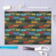 Eine Flügelgruppe aus Drachen in den Farben Schwarz, Braun, Rot, Orange, Gelb, Blau und Grün fliegen Flügel über eine tiefgrüne Kulisse, die sich nach oben erhebt. Die Drachen werden in einem Tätowierungsstil gezeichnet.