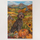 Feiern Sie die Schönheit des Herbstes mit diesem lebendigen Gemälde eines Hundes, der neben einer reichen Erntedank-Ernte sitzt. Die reichen Herbstfarben von Kürbissen, Sonnenblumen und die rustikale Landschaft der Bauernhäuser schaffen eine warme und einladende Atmosphäre, die sich perfekt für jeden Hundefreund im saisonalen Dekor eignet.
