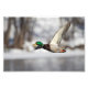 Drake mallard fliegt über die schneebedeckte Winterlandschaft von Nord-Minnesota.