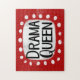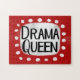 "Drama Queen" ist ein niedliches Textdesign in rot mit schwarzem Text, mit weißer Akzent-Form und weißen, texturierten weißen, weißlichen Punkten, die ihn umgeben.