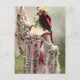 Ein Vintag gefärbtes Foto einer jungen, dunkelhaarigen Frau in einem Blume bedeckten Kleid, das eine dramatische Pose markiert. Blume bedecken auch ihr Haar. Die Farben sind hellrosa und tiefrosa mit einer gelben Touch.