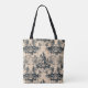 Märchenhafte Burg in einem Jouy-Toile-Druck. Feine Bäume umgeben eine bezaubernde Burg mit dem Hintergrund des alten Elfenbeins und bedruckt in tiefer Mitternachtsblau.