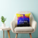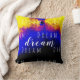 Auf der Vorderseite des Kissens erscheint "Traum" in einem fett gedruckten, über Reihen wiederholter einfacher Buchstaben überlagerten Skript, beides weiß, und weist auf die Bedeutung des Träumens in seinen vielen Bedeutungen hin. Diese ermutigende, inspirierende Botschaft wird in einem tiefblauen, bordeauxroten und gelben, abstrakten Kunstdesign präsentiert. Auf der anderen Seite, das gleiche Design ohne Nachricht.