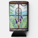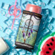 Boho can cooler. A rustic wood window with a white, orange and purple feathered dreamcatcher hanging in the window along with a string of colorful crystals. The window overlooks a beautiful scene of forest and mountains.