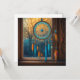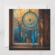 KI-Kunst, die einen Traumfänger in einem Fenster zeigt, das schöne Herbstbäume überblickt. Blauer und orangefarbene Perlen und Federn.