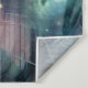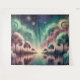 Dieses ätherische Design stellt eine ruhige Traumlandschaft dar, in der stilisierte Bäume mit Spiraldächern einen reflektierenden Wasserweg unter einem kosmischen Himmel bilden. Aquamarine, Lavendel- und Rose-Farbtöne harmonieren nahtlos mit weichen Wolken, die in geometrischen Wirbel gemustert sind. Der helle Horizont und die himmlischen Akzente schaffen eine ruhige, surreale Atmosphäre, die sich sowohl futuristisch als auch weltlich anfühlt.