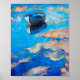 Ein traumhaftes und ruhiges impressionistisches Poster mit einem kleinen blauen Ruderboot, das auf ruhigem Wasser reflektiert, umgeben von weichen, farbenfrohen Wolken und lebhaften Farben.