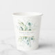 Feine, naturlich inspirierte Vegetationsarrangements inklusive blauem Kaugummi Eukalyptus mit Goldplätschern und Goldblattdrähten sowie einzigartige Design-Layouts machen dieses Set zu einem aufregenden Hochzeitsfest für jedes Jahr. Der hier gezeigte Hochzeitspapier-Becher ist mit einer üppigen Vegetation versehen, die um die Braut, die Bräutigam und das Hochzeitstag herum angelegt ist. Sehen Sie sich den Sammellink auf dieser Seite an, um alle passenden Elemente in diesem schönen Design zu sehen, oder suchen Sie ID817, um andere Teile und Farboptionen für dieses Set zu sehen.