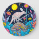 Eine skurrile, farbenfrohe Abbildung eines gepunkteten, kaninchenähnlichen Wesens, das auf einem kleinen Hügel stehend ist, umgeben von üppiger Vegetation und hellen Blume unter einem Sternenhimmel mit leuchtendem Mond