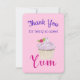 Eine Dankeschön-Karte, entworfen mit einer Illustration eines leckeren Kuchens mit rosa Wirbel und einer Beere mit Blätter, die im Zuckerguss eingebettet sind. Yum, geschrieben in heißen Rosa mit einem extravaganten trendigen Schriftart. Set auf einem weichen rosa Hintergrund.