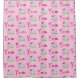 Ein Duschvorhang, der mit einem wiederholten Bild eines leckeren Kuchens mit rosa Wirbel und einer Beere mit Blätter im Zuckerguss gestaltet wurde. "Yum" geschrieben in heißen Rosa mit einem extravaganten trendigen Schriftart. Set auf einem weichen rosa Hintergrund.