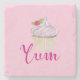 Stone Untersetzer mit einem leckeren rosa Kuchen mit schmuckigen Wirbel aus rosa Zuckerguss mit einem gelben Kuchenhalter. Himbeere mit Stamm und Blätter oben. Träumend und köstlich. Text sagt Yum in einem extravaganten trendigen Schriftart. Set in Pastellrosa.