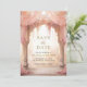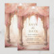 Amaze your guests with this elegant Indian wedding save the date featuring beautiful arches decorated with curtains and pink flowers.