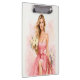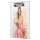 A beautiful woman in a flowing pink dress holds a bouquet of flowers and a pair of high heels in this elegant watercolor illustration.