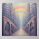This whimsical poster features a dreamy forest path that stretches under towering pine trees, leading to a vibrant, glowing rainbow arching across a misty, pastel sky. Finished as an oil paint art print.
