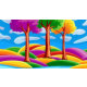 Drei Bäume mit verschiedenen Blätter auf einem farbenfrohen Feld mit blauen und weißen Wolken, lebhafte Farben, Cartoon Stil, fröhliche Atmosphäre, whimsical, hell und spielerisch.