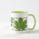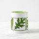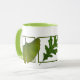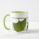 Drei Blätter über dieser Tasse schaffen eine ruhige Stimmung. Grafik eines Ginkgoblattes, eines Eichenblattes und eines Ahornblattes.
