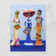 Drei farbenfrohe Katrinas über einer blauen Postkarte.