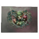 Drei Feen, die Begleiter des magischen Herzens. Das Herzstück ist die Mittelmärche, deren lebhaftes grünes Haar sanft im Wind weht und durch elegante goldene Hörner verstärkt wird. Ihre spitzen Ohren ragen stolz aus, während sie in aufwändig grüne Kleidung gekleidet ist, die mit aufwändigen Mustern geschmückt ist, die ihr anmutiges Aussehen verstärken. Die zwei kleinen Feen sind in ähnlich feinen, grünen Roben gekleidet, die mit feinen Details geschmückt sind.