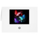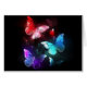 Drei helle, rote, lila, grüne, strukturierte Nachtschmetterlinge auf schwarz-leuchtendem Hintergrund.