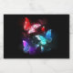 Drei helle, rote, lila, grüne, strukturierte Nachtschmetterlinge auf schwarz-leuchtendem Hintergrund.